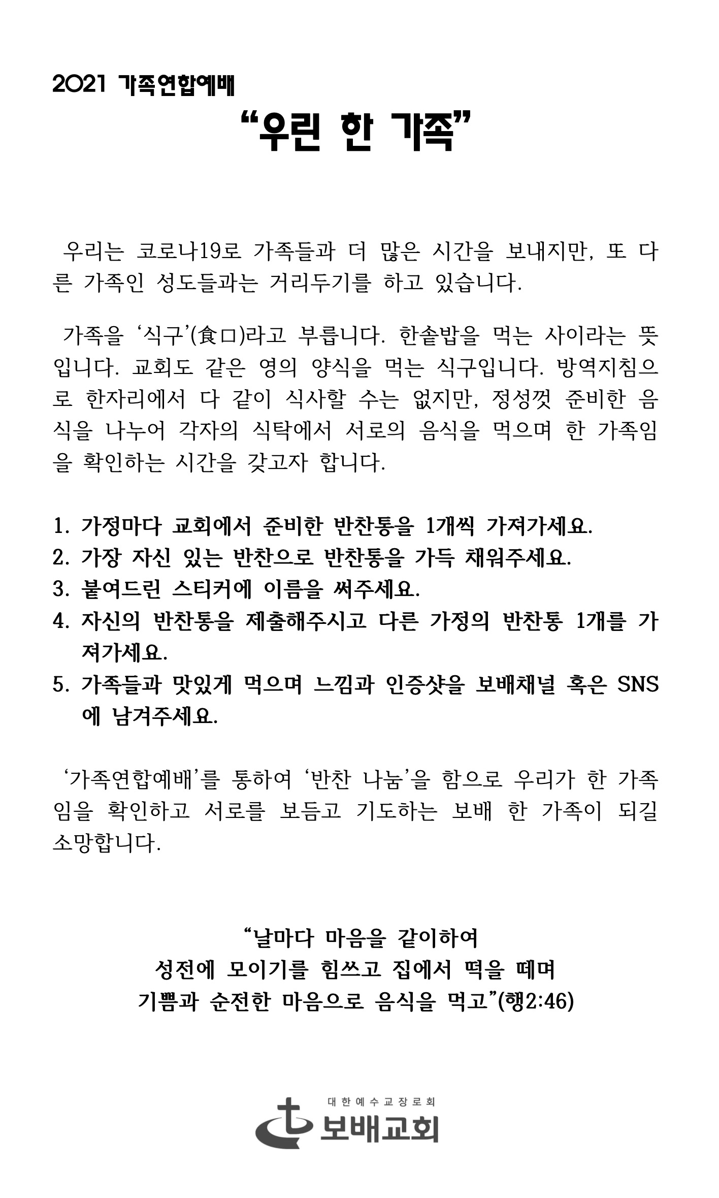 가족연합예배 반찬나눔행사 안내